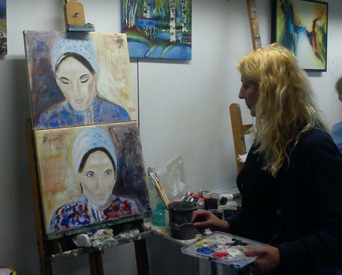Kunstmaler Jata Stojanovic, Engesvang ved Silkeborg. Malerier med titel, størrelse og pris.