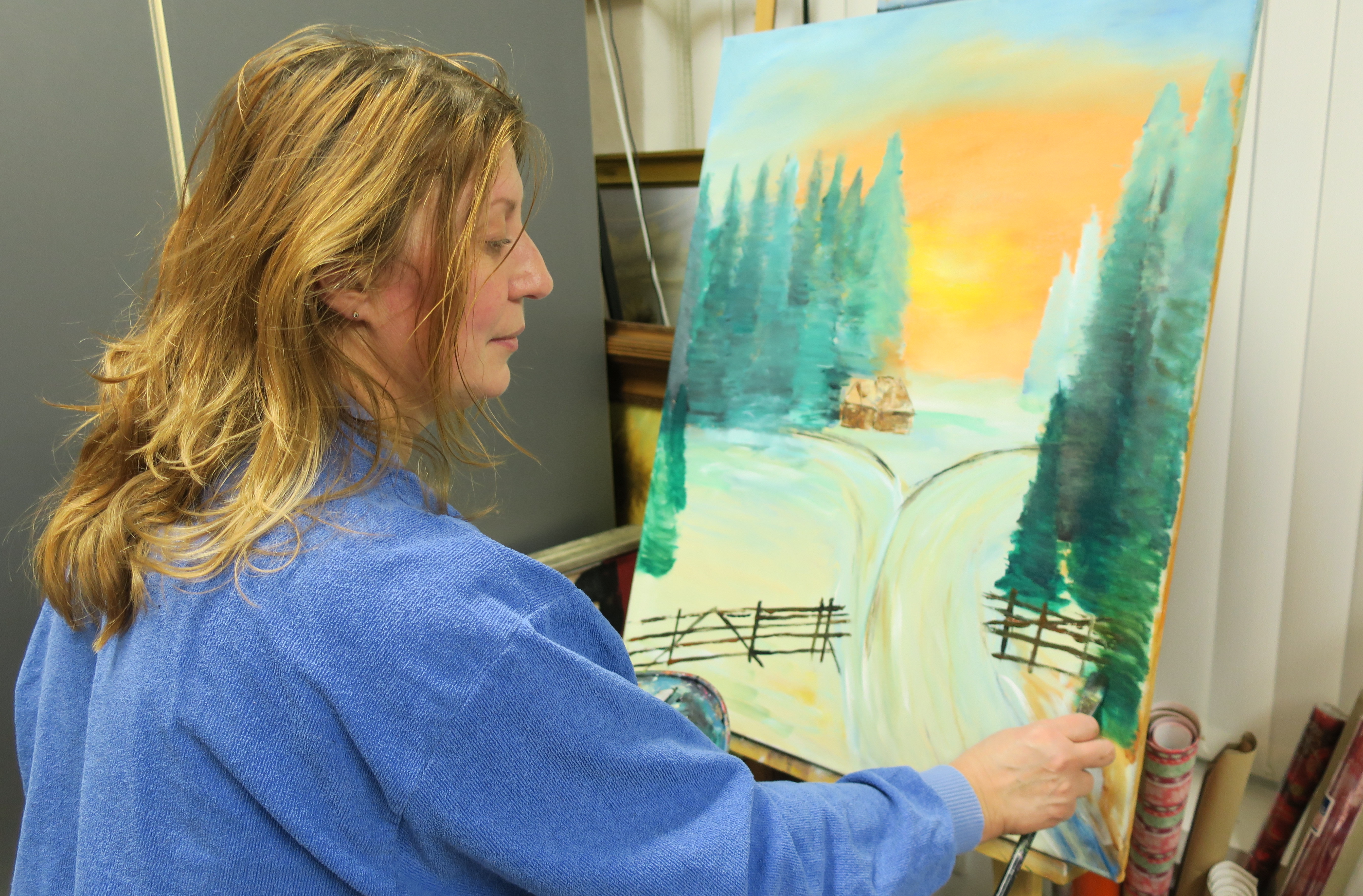 Kunstmaler Jata Stojanovic, Engesvang ved Silkeborg. Malerier med titel, størrelse og pris.